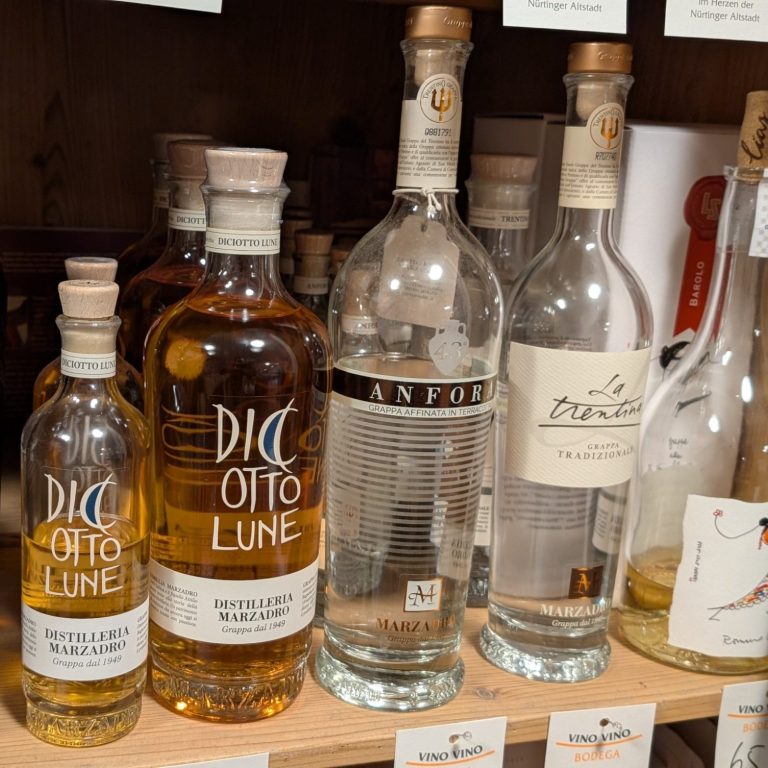 7 verschiedene Grappa von weiß bis holzfassgereift aus unterschiedlichen Hölzern werden verkostet. Dazu gibt es Käse/Wurst, Oliven und Brot.